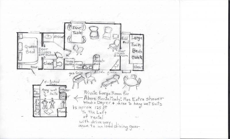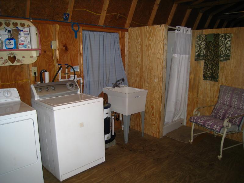 Below,your private Laundry facilities with an extra shower, place to hang wet suits & charge equipment aprox 125 feet from your cabin, walk or drive up to it. You will recieve your own key. Also has fans, A/C & small elec. heater. Wifi, can be used as office. Click on right bottom corner to enlarge.