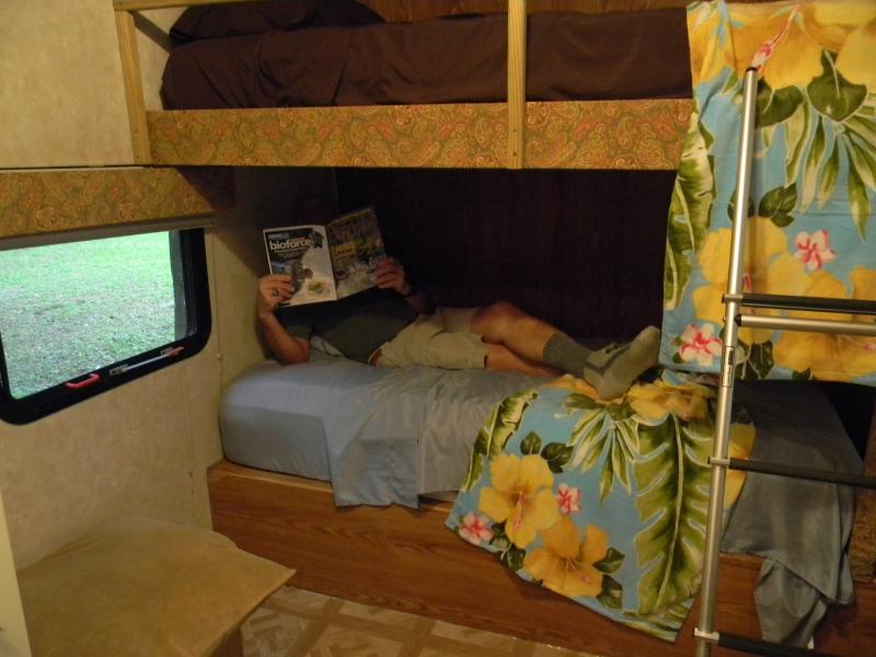 The Beds below are standard Twin size beds custom bed with no squeeking with very comfortable mattresses. Both bedrooms have doors that close for privacy. A folding bed for this room is available. This is a 6 foot man to show size of bed.